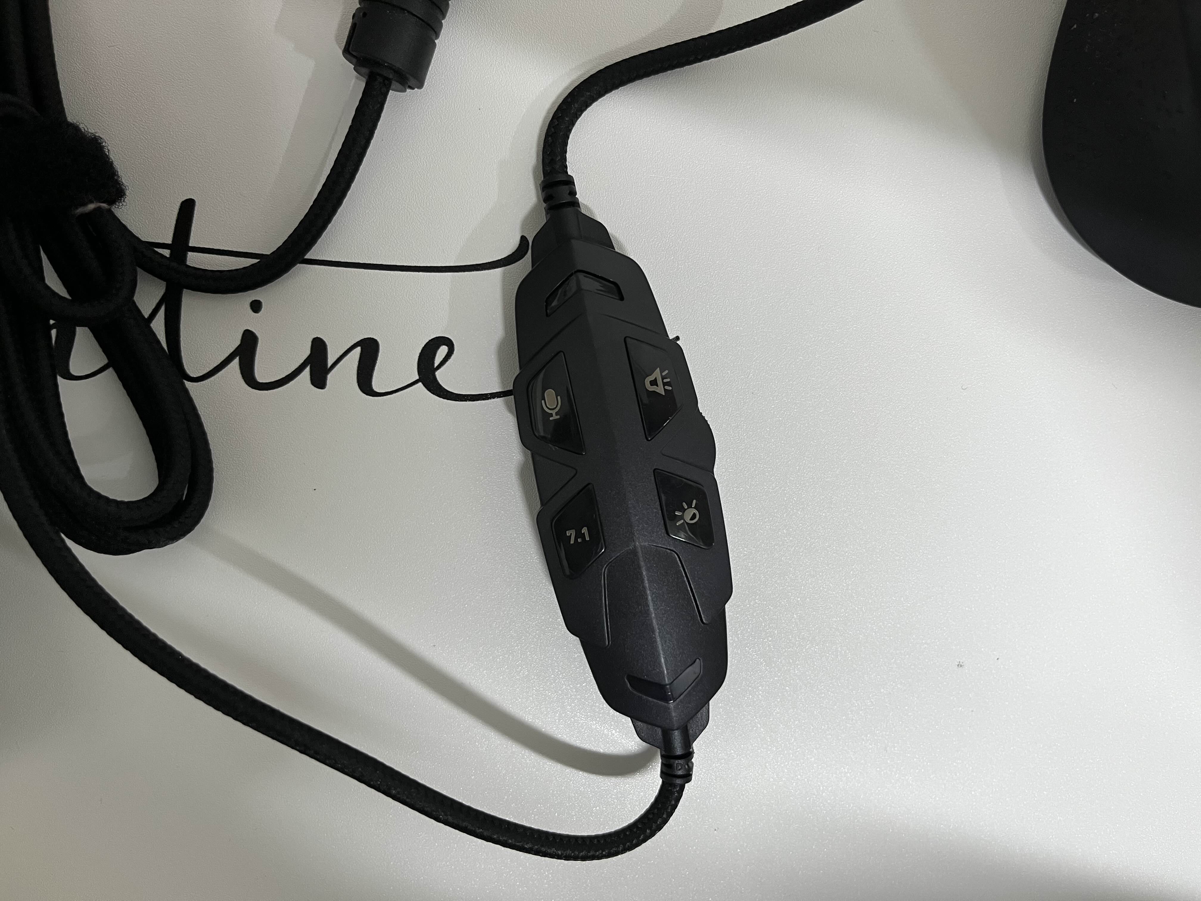 이 헤드셋은 노이즈캔슬링 마이크와 7.1 가상채널 기능이 있다. 저 컨트롤러에 7.1 채널과 볼륨, 마이크 On/Off, 헤드셋 불빛을 조절하는 버튼이 있다.