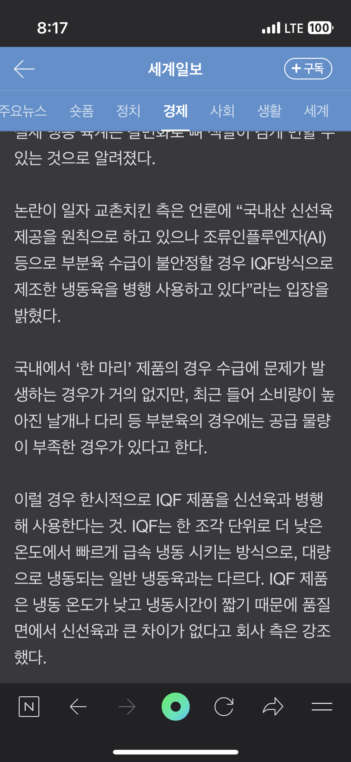 그런데 오랜만에 먹었던 콤보는 닭뼈가 까맣고 잡내는 덜하지만 확실히 맛이 뭔가 달랐다. 그래서 뭐지 냉동육만 썼던걸로 알았는데, 알고보니 부분육 같은 경우 수급 문제로 냉동육을 쓴단다…