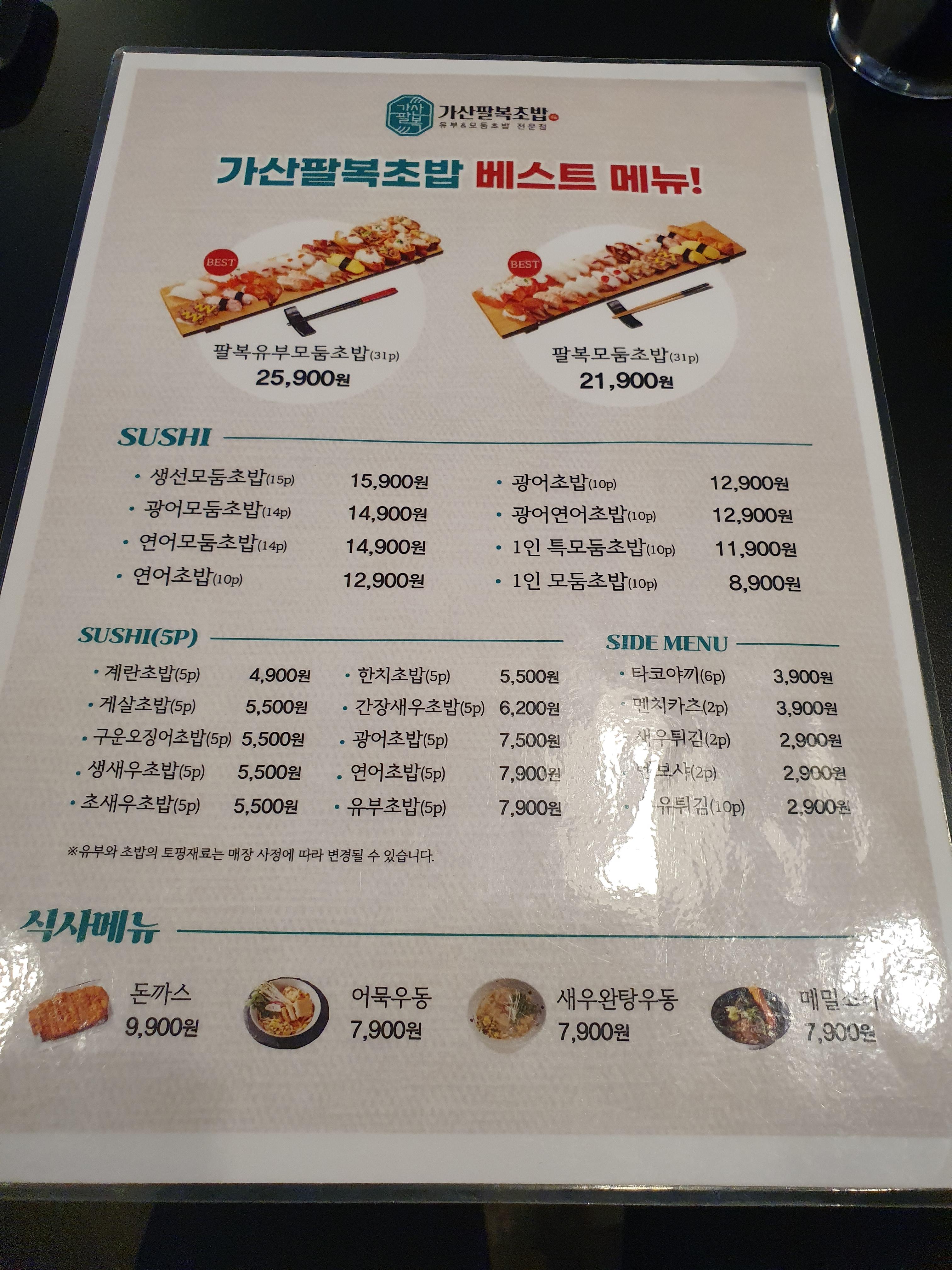 회 초밥 종류는 광어, 연어가 있고 그 외 나머지 초밥들이 있다. 그리고 여기가 모듬초밥 메뉴가 따로 있는데 31피스에 21,900원과 25,900원으로 운영된다. 그래서 가성비 초밥이라고 불리는데 초밥은 그저 그랬다.