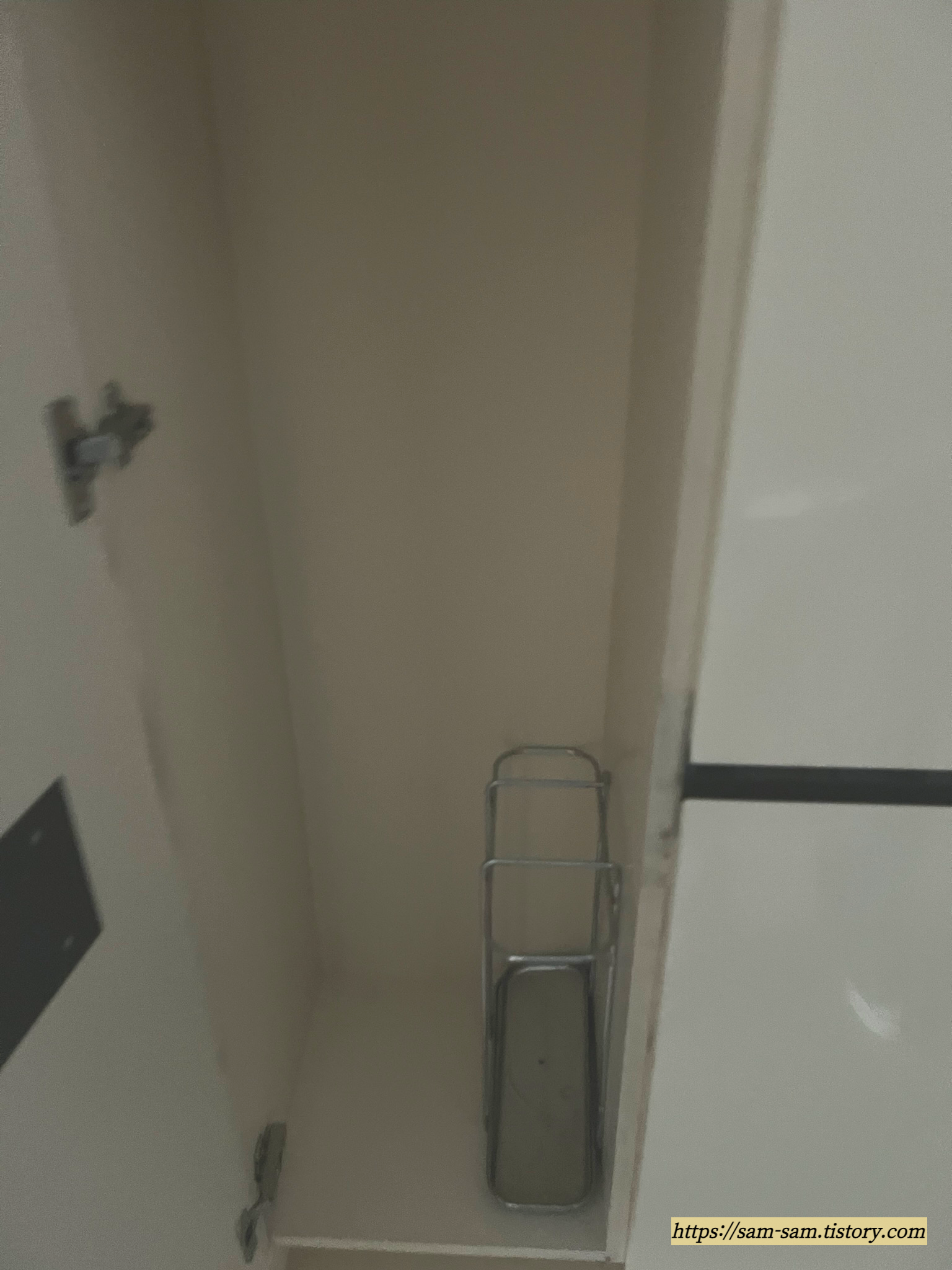 세탁기는 LG 세탁기였고 싱크대 밑으로는 수납공간은 따로 없다. 싱크대는 살짝 직사각형이라서 조금은 싱크대다운 모습이다. 싱크대 옆으로는 냉장고가 있고, 그 앞에 있는 아일랜드식탁에도 수납공간이 있다. 아일랜드 식탁은 제거가 불가능하다. 세탁기 맞은편에는 전자레인지를 넣을 수 있는 공간과 수 많은 수납공간이 또 있다. 전자렌지 쪽에도 2구 콘센트가 있으나 위쪽 1구는 막혀있다.