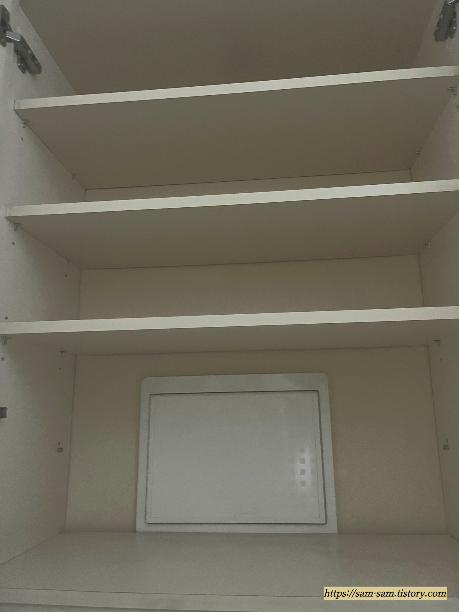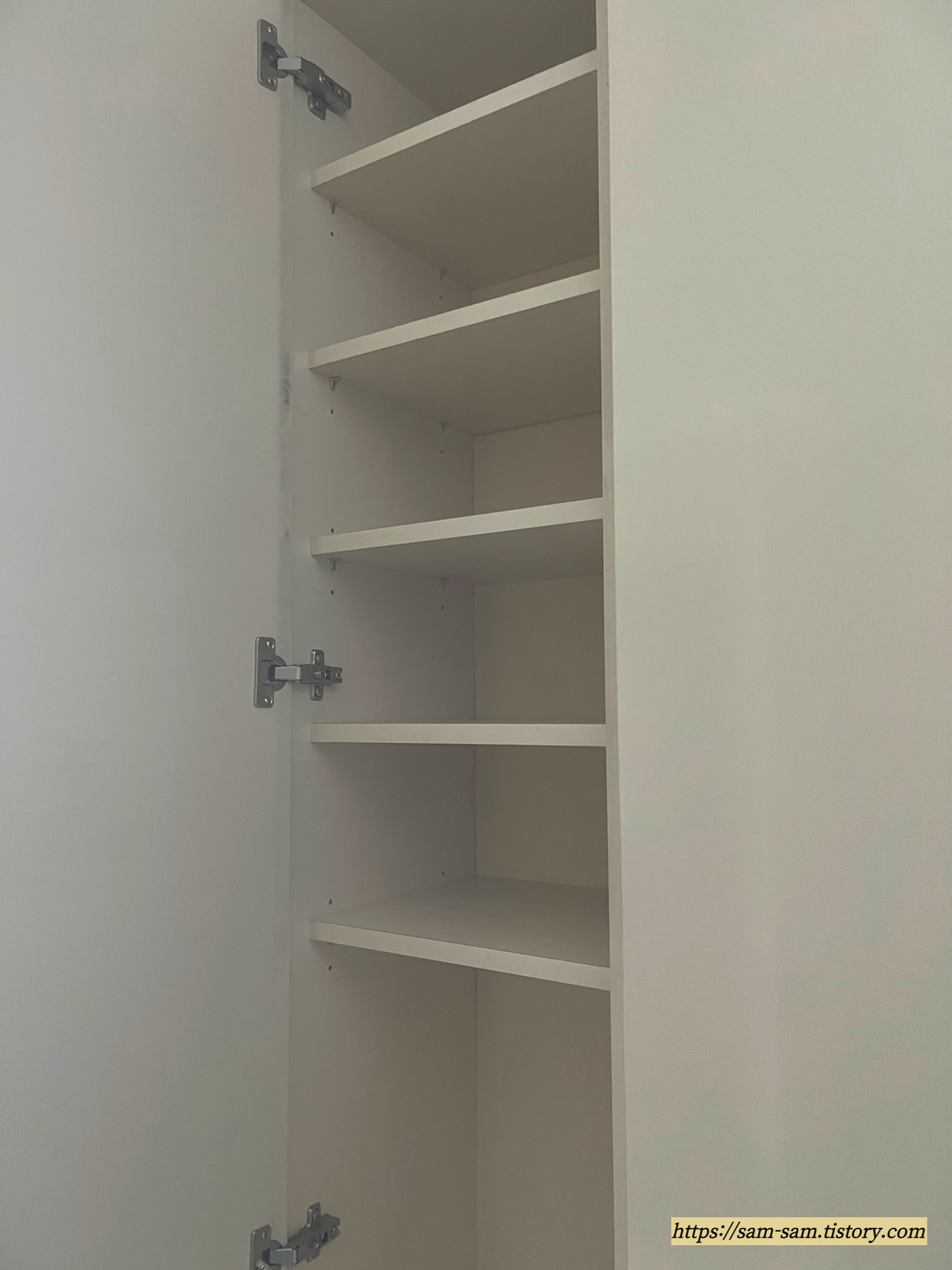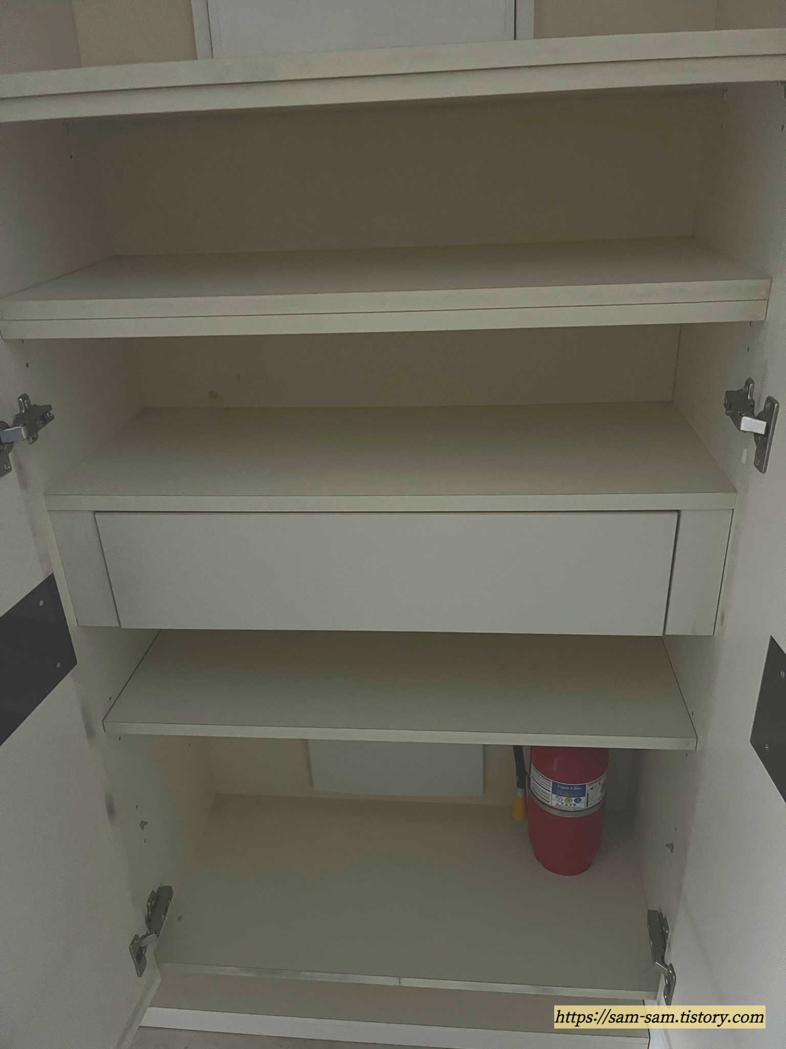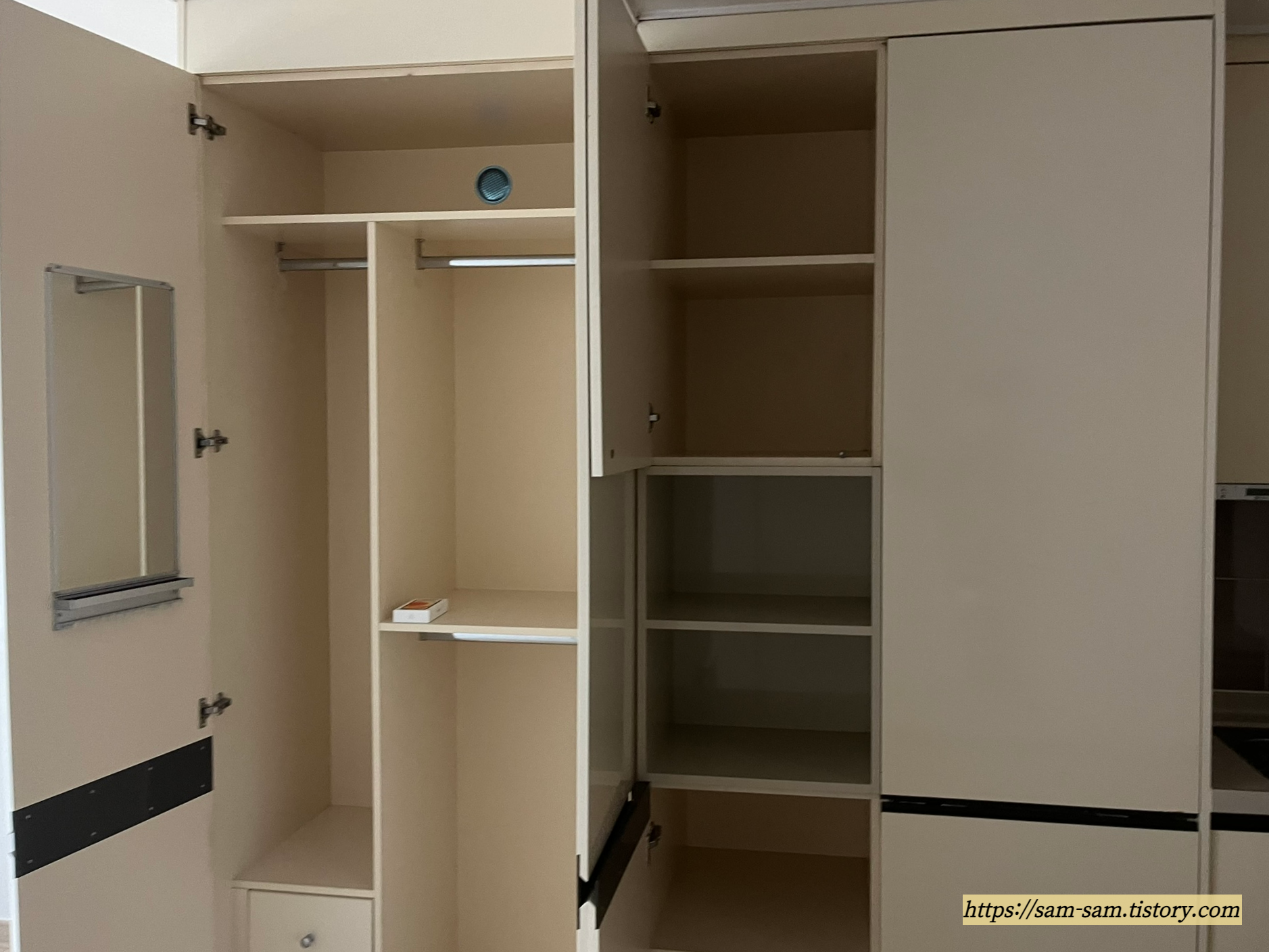 옷장 내부는 이렇게 생겼다. 거울이 별도로 있고 그 아래에 넥타이 같은 걸 걸 수 있는 곳이 있다. 행거 부분도 세 구획으로 나뉘어 있다. 다만 위에서 말했듯이 옷을 걸어서 보관하는 경우엔 조금 부족하게 느낄 수 있다. 그래서 행거를 별도로 두는 게 좋다고 한 것,