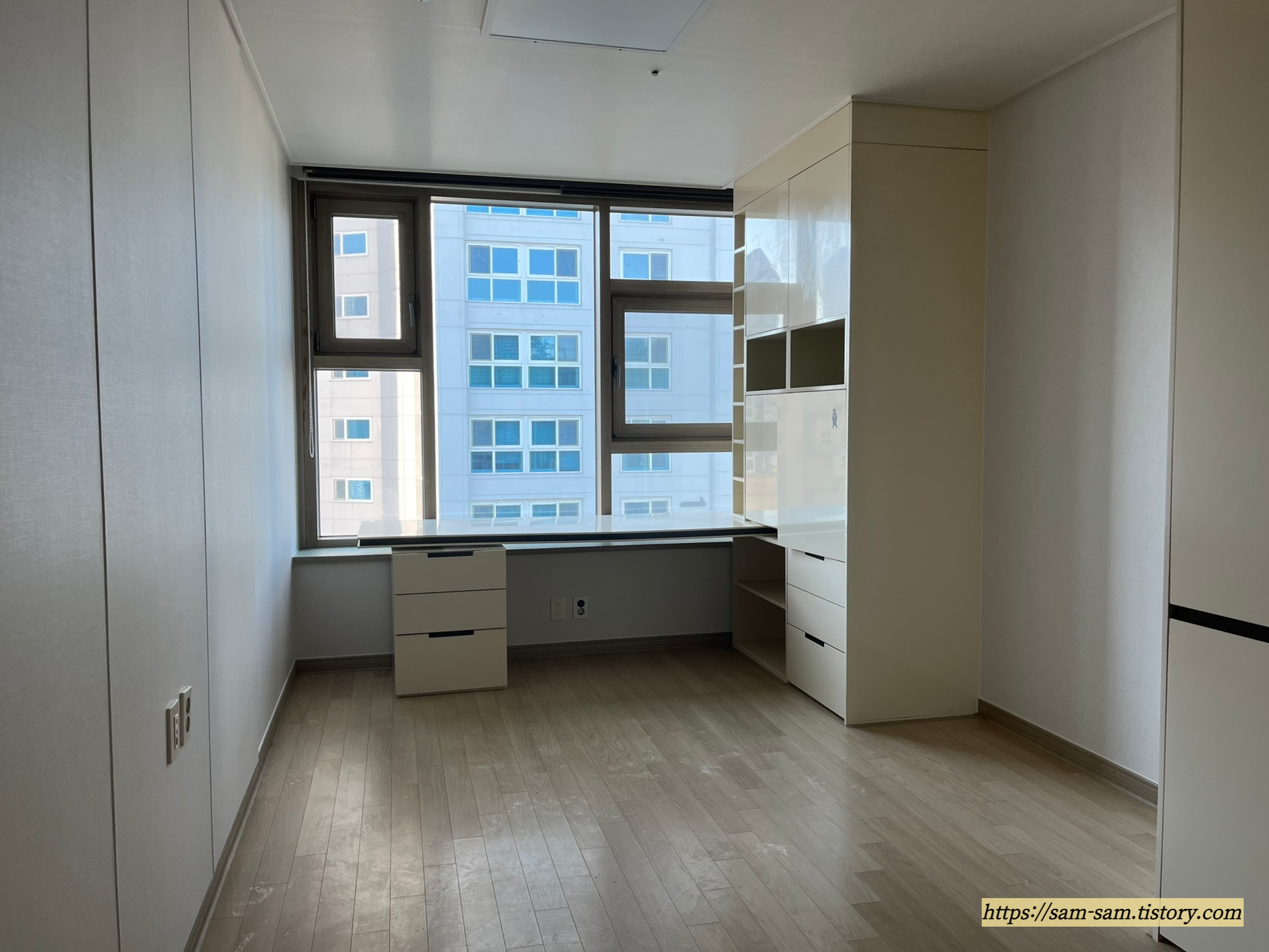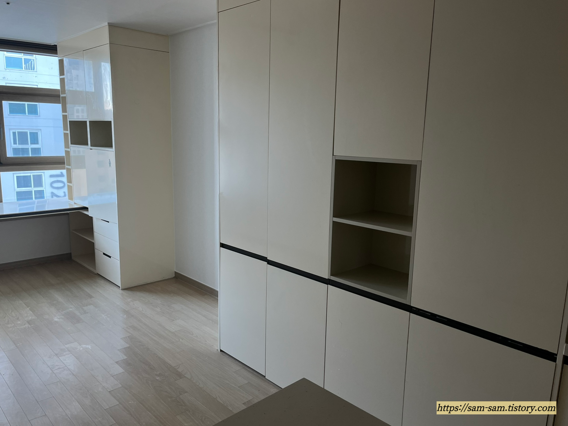 이 쪽은 책상과 옷장 부분이다. 보통 그 사이에 침대를 놓긴 하나 책상을 뺄 수 있으면 책상 쪽에 두는 것도 괜찮을 것 같다. 그리고 책상과 옷장 사이에 행거를 두면 괜찮을 것 같다. 옷장에도 역시나 수납할 곳은 많지만 옷을 걸어서 보관하는 사람 입장에선 조금 부족할 수 있다.