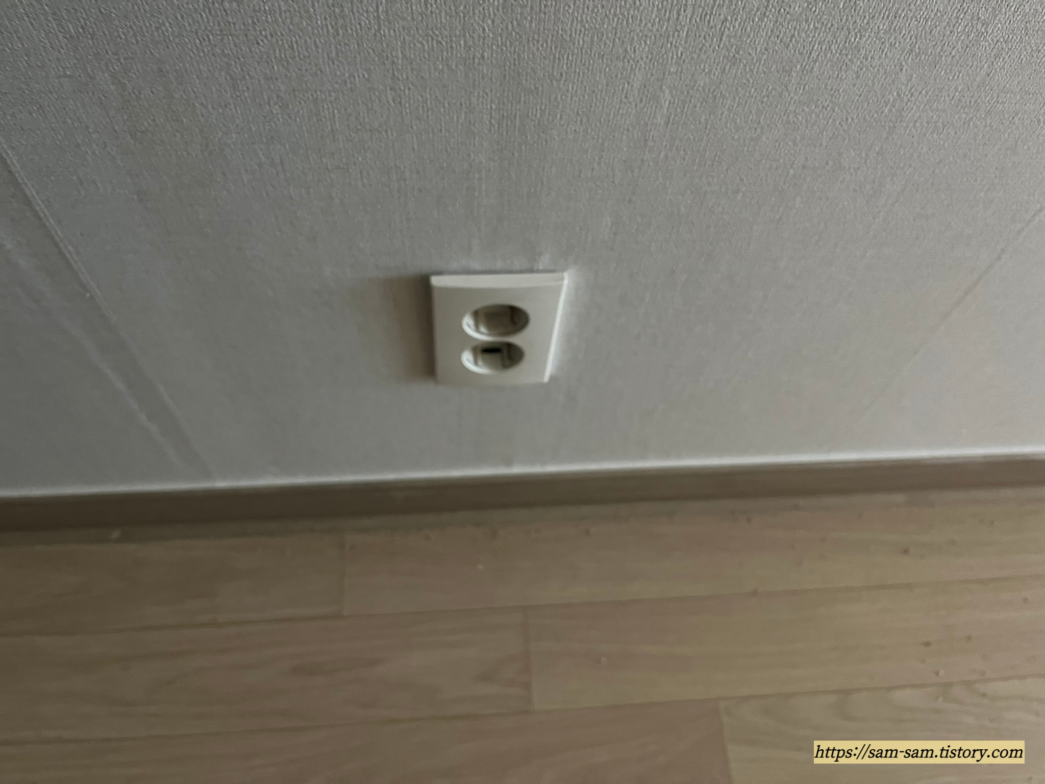 다만, 중앙난방 형태이고 기본 옵션인 에어컨의 연식이 좀 된 에어컨이다. 준공연도가 12년도인 점을 고려해야 한다. 주방을 제외한 방 부분에는 입구 쪽에 2구 콘센트, 월패드 밑에 2구 콘센트, 책상 쪽에 2구 콘센트가 있다. 하지만 책상 쪽 콘센트는 1구나 다름없다. 그 이유는 아래에서 설명한다.