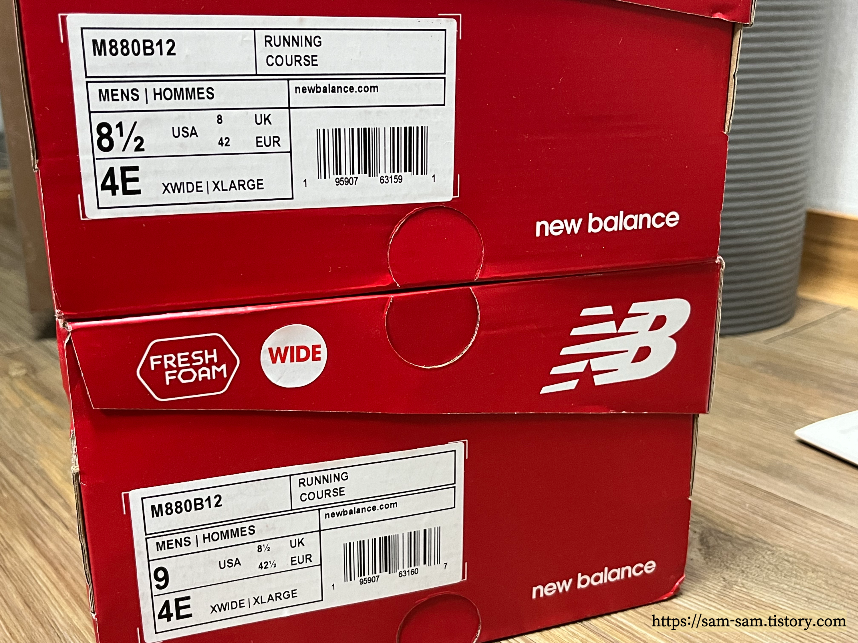 내가 구매한 모델은 M880B12로 발볼 넓이가 다양하게 나온다. 4E까지 출시가 되었으며, V13은 4E가 없는 것으로 알고있다. 880은 약회외 및 회외 신발로 쿠셔닝화이다. 플릿러너 유튜브를 보면서 1080 모델과 고민도 했지만 880이 구매하기 용이해서 해당 모델을 구매했다. 위 사진의 사이즈는 265와 270mm의 신발이다.