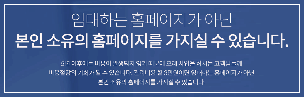 따라서 홈페이지를 임의적으로 수정할 수 있으며, 5년 이후에는 비용이 발생하지 않는다. 비용적인 측면은 페이지 수 등에 따라 달라 상담을 해보아야 알겠지만 대략적으로 위 사진처럼 나타내고 있다.