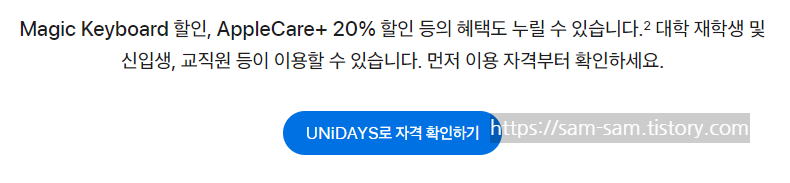 애플 교육할인스토어에서 구매를 하려면 인증을 받아야한다. 유니데이즈 인증은 회원가입 후 대학 학생증이나 신입생의 경우 대학교 합격증을 제출하면 된다. 교직원의 경우 재직증명서를 발급다아 제출하면 된다. 이번 신학기 프로모션에 해당하는 제품들은 '맥북에어 / 맥북프로 / 아이맥 / 아이패드 에어 / 아이패드 프로'이고 2024년에 추가로 '맥미니 / 아이패드 10세대'가 추가되었다. 따라서 다양한 애플 유저들에게 여러 선택권이 주어진 것이다.