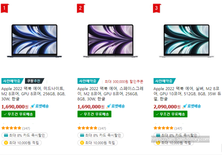 사진은 M2 모델이지만 큰 폭으로 할인하는 것을 볼 수 있다. 이보다 더 할땐 11%까지 할인하는 경우도 보았다. 그래서 필자는 항상 가격비교를 해보고 어느 곳에서 구매하는 것이 합리적인지 판단한다.