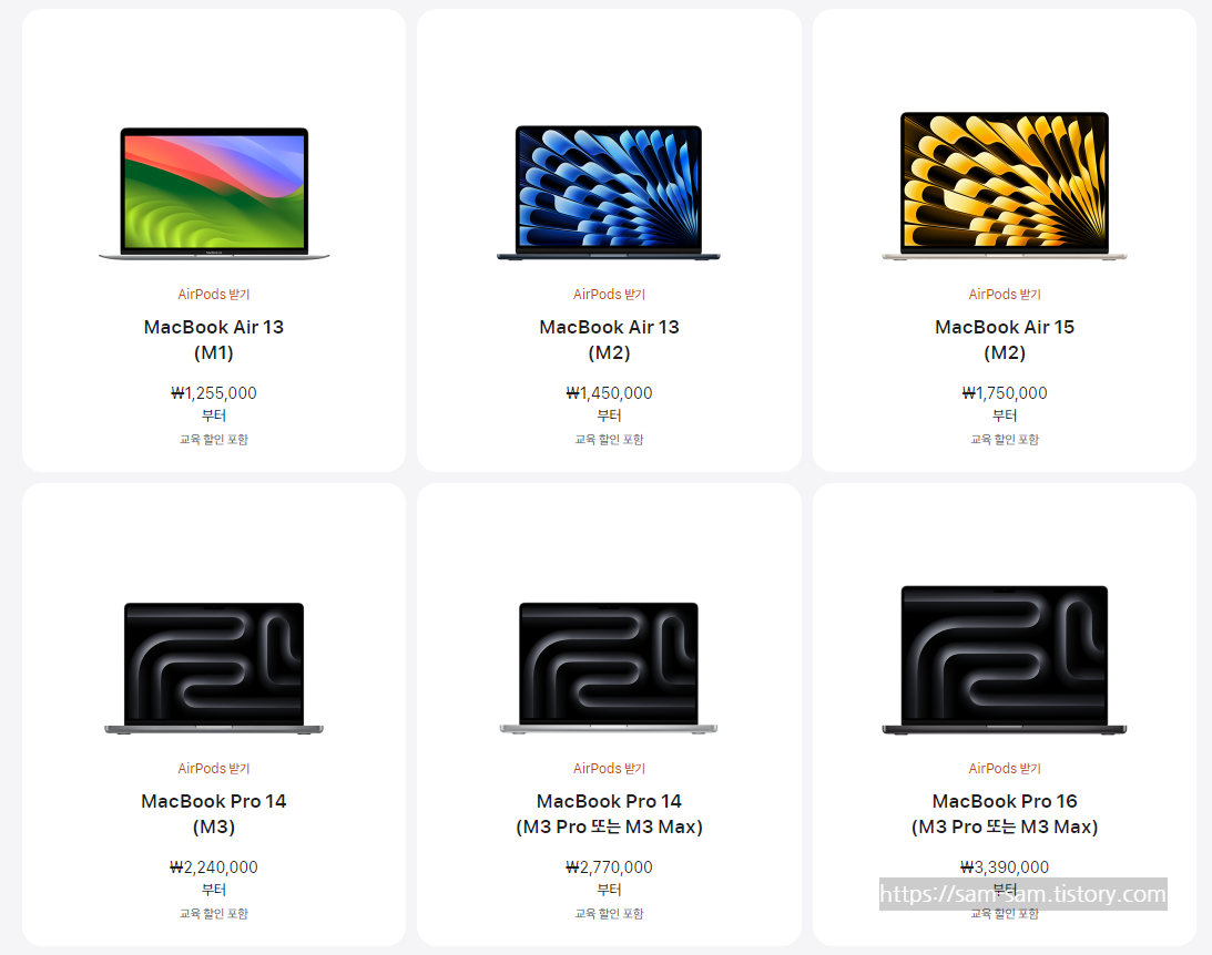 에어팟 3세대를 제공받는 모델은 M1, M2 맥북에어 / M3 맥북프로 전 모델 / M3 아이맥이다. 물론 금액을 추가하면 상위기종인 에어팟3 맥세이프 충전 모델이나 에어팟프로2를 증정받을 수 있다. 이는 맥미니에도 동일하게 적용되는 조건이다.